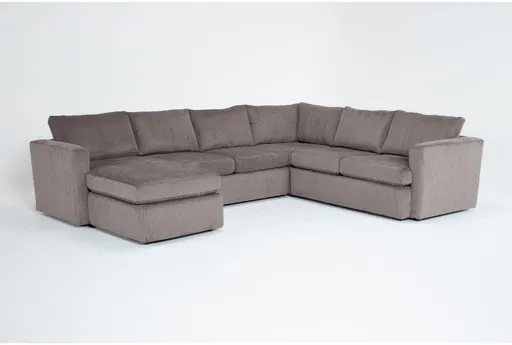 Introducing the Basil Grey Brown Fabric Modular 125" 4 Piece U-Shaped Sectional with Left Arm Facing Chaise, perfect for any living room. This sectional in bear hug grey combines comfort and versatility, making it a great choice for family gatherings and relaxation. Enjoy the modern design and the soft, durable fabric for a cozy seating experience.
