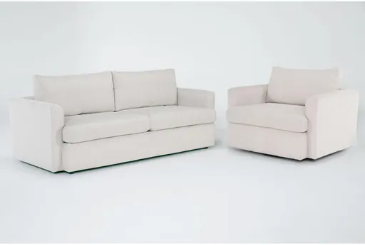 Basil Sofa Bed & Swivel Oversized Chair & A Half Set brings modern, multipurpose seating to the living room with a queen memory foam sleeper sofa paired with an oversized swivel chair and a half. Upholstered in ivory fabric with loose, reversible back cushions and slim track arms, the set offers a relaxed, clean-lined presence that works in contemporary and transitional spaces. The sofa converts to a queen-size memory foam mattress supported by a metal frame while tapered alder legs add a grounded profile. Spot clean as needed and follow the included care instructions to keep the 100% polyester upholstery fresh.