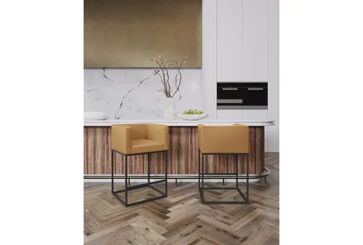 Bass Brown Faux Leather 25" Counter Height Stool With Arms offers comfortable, compact counter seating for your kitchen or dining nook with a curved back and armrests that help you settle in for meals and quick conversations. Upholstered in brown faux leather over a padded seat and supported by a slim metal base, this modern counter stool balances comfort with a light visual footprint. At a 25" counter height it fits standard counters and dinettes, making it a practical choice for everyday dining and food prep seating.