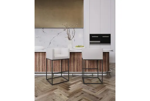 Bass Cream Faux Leather With Arms 29" Barstool pairs a cushioned seat, curved back and integrated arms to deliver comfortable, modern seating upholstered in cream faux leather for easy care. The black metal geometric base anchors the stool and keeps the visual profile light while providing stable support for everyday use. At a 29-inch seat height this barstool suits kitchen islands and bar counters, making it a practical option for dining and food prep areas.