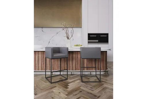 The Bass Grey Faux Leather With Arms 25" Counter Height Stool pairs a modern silhouette with practical comfort. Upholstered in Bass grey faux leather over a padded seat and curved back, it delivers supportive seating for kitchen islands and dinettes while integrated armrests add steady support during longer meals. A metal square base keeps the footprint minimal and provides reliable stability for everyday use.
