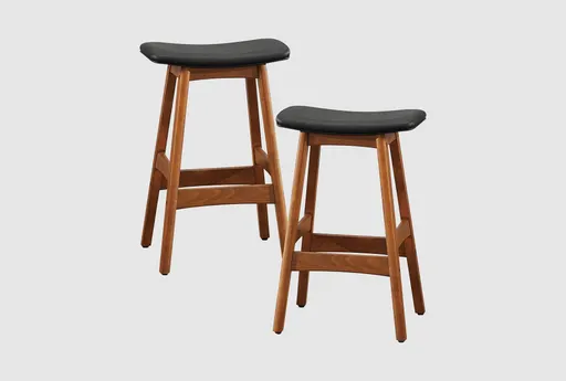 Bring a modern silhouette to everyday seating with Baylor Black saddle counter stools. A contoured polyurethane saddle seat in black pairs with walnut legs for a warm contrast and a supportive, medium-firm profile. The backless, armless design keeps sight lines open while the tapered legs and block-style stretcher provide stable support and a balanced, symmetrical stance. Available as a set of 2, these counter height stools combine clean lines and smooth wood grain for a mid-century modern and scandinavian-leaning look that complements modern living room furniture and kitchen decor.