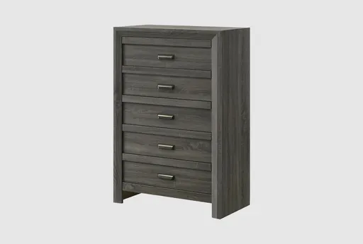 Compact but capable, Baylor Grey 5 Drawer Chest brings modern storage to small spaces with a narrow vertical silhouette that fits tight corners and apartments. The textured paper veneer in a neutral grey pairs with black metal drawer pulls and a matte finish for subtle graphic interest and layered wood grain. Five smooth-glide drawers include a dedicated lingerie top drawer and dovetail drawer joinery for reliable, long-lasting performance. A low plinth base and boxy profile offer a stable surface for a lamp or decorative display while keeping a light visual presence.