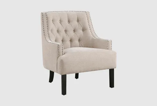 The Belfield Natural Cement Beige Accent Chair combines comfort and style with its traditional design. The chenille fabric is made from 100% polyester, offering a soft and durable seating experience. Perfect for any living room, this chair features slope arms and a sturdy wood frame. Traditional design with button tufted detailing. 100% polyester chenille fabric for comfort. Durable wood frame for stability.