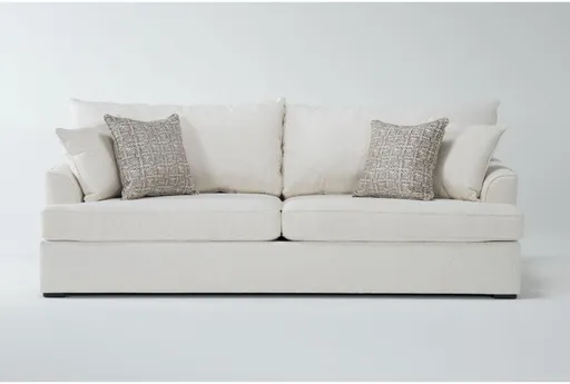Introducing the Belinha II Opal White Fabric Queen Memory Foam Sleeper Sofa Bed. This versatile piece combines comfort and functionality, making it perfect for your living room. The cream-colored fabric and loose reversible back cushions provide a casual and inviting feel, while the track arms add a modern touch. Queen size memory foam sleeper for added comfort. 100% polyester fabric for durability and easy care. Track arms and loose reversible back cushions for a relaxed look.