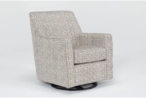 Belinha II Oyster Beige Grey Fabric Swivel Glider Accent Armchair blends club-style comfort with a smooth swivel-glide motion, making it a smart choice for nurseries, reading nooks or smaller living rooms. Upholstered in 100% polyester with a subtle heathered oyster beige and grey pattern, it brings soft texture without overwhelming a neutral palette. Track arms keep the profile tailored and supportive, while the alder wood and metal pedestal conceals the gliding hardware and the reversible seat cushion helps even out wear; professional cleaning is recommended to maintain the fabric.