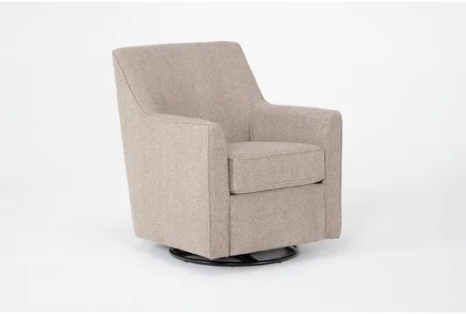 Belinha II taupe beige natural fabric swivel glider armchair blends casual comfort with practical function for reading, nursing, or relaxing. Upholstered in a soft polyester chenille blend, it pairs foam seating with dacron wrapped foam for resilient support and a tight back that helps maintain posture. Slim track arms and a square silhouette deliver a modern profile that complements scandinavian and contemporary decor, while a metal glider mechanism and swivel base let you rock and rotate smoothly. Alder wood accents at the base add warmth and contribute to the piece's structural integrity without overwhelming the neutral palette. Reversible cushions make it easy to refresh the chair's feel and extend longevity, turning Belinha II into an efficient small space solution for apartments, nurseries, home offices, or bedroom nooks. Built with a reinforced frame and durable upholstery, this chair is intended for everyday use and simple care; spot clean as needed and follow professional cleaning recommendations for deeper maintenance. Imagine curling up with a book in a soft beige seat that rotates to the room, delivering modern living room furniture comfort in a compact footprint.