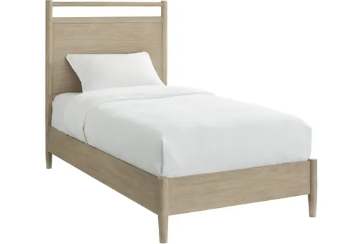 The Benedict Twin Natural Wood Platform Bed with USB combines modern style with practical functionality. The champagne-colored acacia wood with select veneer offers a soft and neutral tone, perfect for any bedroom setting. This twin-size bed is designed with a platform base, eliminating the need for a box spring and providing a clean look with sturdy support.
