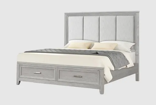 Discover the perfect blend of style and functionality with the Bennett California King Grey Wood & Upholstered Platform Storage Bed. This modern grey bed is crafted from acacia wood, offering durability and a sleek look. The upholstered headboard adds a touch of comfort and sophistication to your bedroom.