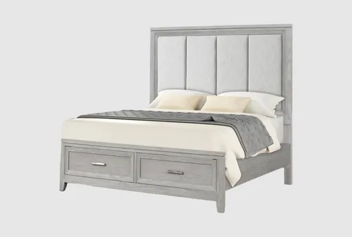 The Bennett Grey Queen Wood & Upholstered Platform Storage Bed combines modern style with practical functionality. Its sleek grey finish and padded headboard bring a sophisticated touch to your bedroom. Enjoy the added convenience of built-in storage drawers to keep your space organized.