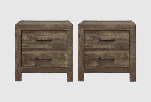 Beri Brown Wood 2-Drawer Nightstand Set Of 2 brings rustic warmth and practical storage to compact bedrooms. The twin narrow nightstands feature a textured brown distressed finish with natural patina and visible wood grain for authentic character. Each piece pairs a sturdy block base with brushed black nickel handles and metal accents, blending wood and metal for a durable, grounded look. With a symmetrical rectangular silhouette, this set complements rustic and modern farmhouse interiors while serving as a small space solution.