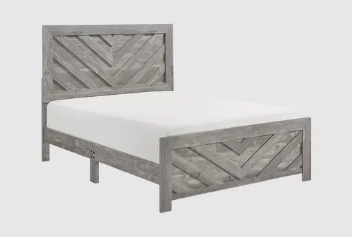 Beri Grey California King Wood Panel Bed With Chevron Headboard makes a strong statement with a chevron-patterned headboard and matching footboard finished in a brushed grey that emphasizes textured wood grain. The platform profile and block base provide stable mattress support without a box spring, while an Asian hardwood frame paired with MDF board panels balances durability with a refined veneer surface. Its rustic farmhouse lines blend geometric detail with casual warmth to anchor a primary bedroom or guest suite.
