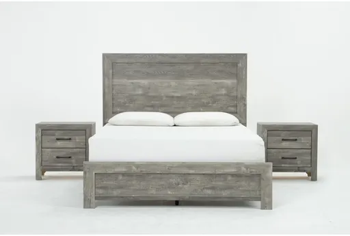The Beri Grey Full Panel Bed with 2 2 Drawer Nightstands pairs a rustic, modern farmhouse silhouette with practical storage for everyday living. A tall paneled headboard and matching paneled footboard show a textured wood grain finish in grey with natural undertones, creating a neutral palette that coordinates easily across bedroom styles. The frame features an engineered wood core with reinforced side rails and a slat support system for dependable mattress support and adjustable base compatibility. This full bed and nightstand set is an apartment-size friendly solution that keeps bedroom storage organized without taking up extra floor space.