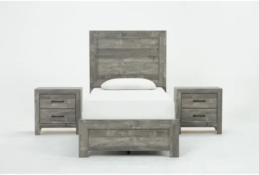 Beri Grey Twin Panel Bed W/ 2 2 Drawer Nightstands brings rustic charm to a kids' room with a natural grey finish and clean panel lines. Asian hardwood and engineered wood construction provides stable support for a twin mattress while the panel headboard offers visual presence without taking up extra space. Each matching nightstand includes two drawers for bedside storage, and the bed is adjustable base compatible for flexible sleep options.
