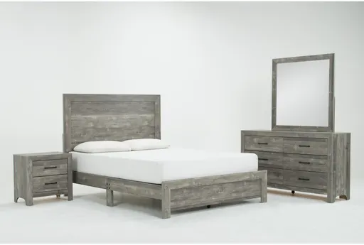 Beri Grey Cal King Panel Bed W/ Dresser/Mirror & Nightstand brings a rustic, natural look to the bedroom with a greywashed finish that highlights the wood grain. The California King panel bed offers a tall headboard, low-profile footboard and a frame designed for adjustable bases to add modern comfort. This coordinated bedroom set pairs a dresser and mirror with a nightstand, built from Asian hardwood and engineered wood for steady support and straightforward assembly.