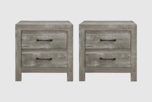 Beri Grey Wood 2-Drawer Nightstand Set Of 2 | Asian Hardwood pairs a compact, rustic silhouette with practical bedside function, offering two small nightstands that suit apartments, guest rooms, or nurseries. Each piece combines Asian hardwood and engineered wood for stable support and is finished in a textured grey surface with metal handles that accent the block base. The two drawers provide easy-access storage for books and nighttime essentials while the top surface works well for a lamp or decor.