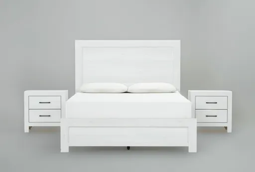 Beri White Cal King Panel Bed W/ 2 2 Drawer Nightstand pairs a clean white panel headboard with generous storage and two matching nightstands to keep a bedroom calm and organized. The design uses an Asian hardwood frame and MDF panels for steady support and a smooth painted finish. California King sizing gives plenty of sleeping area while the rustic profile and simple lines suit neutral palettes and calm interiors.
