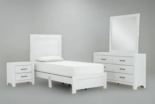 Beri White Twin Panel Bed W Dresser Mirror And Nightstand brings a clean, minimal look to kids' rooms or other bedrooms with a soft white finish and rustic panel details. The set pairs an Asian hardwood frame with MDF board panels for steady support, while the twin bed's panel headboard and footboard create a tidy, grounded profile. A dresser and matching nightstand provide practical storage to keep bedside items and clothing organized, making the suite simple to style and personalize.