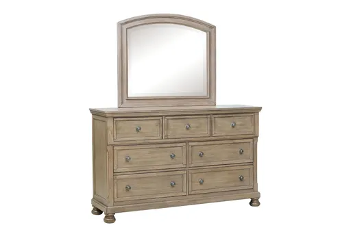 Bethlyn Grey 7-Drawer Dresser with Mirror delivers generous storage and classic traditional styling to your bedroom. Its grey wood finish, moulded top and turned bun feet create a warm, timeless presence while seven smooth-glide drawers keep clothing and linens neatly organized. The included framed mirror and simple round metal knobs make daily routines easier and give the piece a finished look that anchors the room.