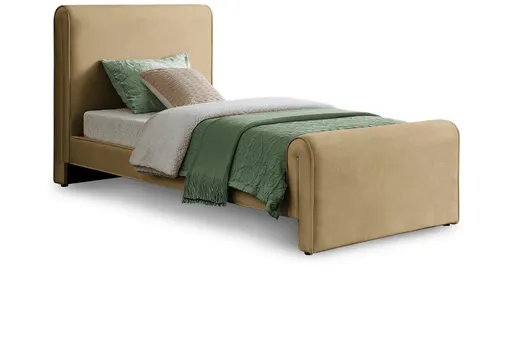 Bexley Camel Twin Velvet Upholstered Platform Bed pairs cloud-like comfort with a modern, low-profile silhouette that anchors a kids' or guest room. Upholstered in camel velvet over an engineered wood frame with foam padding, it provides a plush headboard and a soft-touch footboard for reading or lounging. The platform base supports a mattress without the need for a box spring, simplifying setup while delivering a stable, supportive foundation. Twin scale fits compact spaces and offers a comfort-forward bed that balances function with refined materials.
