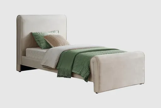 Bexley Cream Twin Velvet Upholstered Platform Bed brings plush, cloud-like comfort and a compact, modern profile ideal for a kid's room. Upholstered in velvet with foam padding over an engineered wood platform frame, it provides a cushioned headboard and a supportive base that does not require a box spring. The twin footprint saves floor space while offering a sturdy sleeping surface that adapts as needs change.