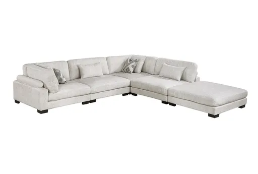 Introducing the Bianca Beige Microfiber 135" 5 Piece Modular L-Shaped Sectional With Ottoman: the perfect addition to your living room for a casual and comfortable experience. This right-facing sectional is designed with 100% polyester fabric in a soothing beige color, ensuring both durability and a soft touch. Its modular design allows you to customize the layout according to your space and needs.