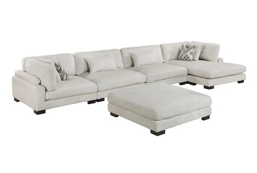 Transform your living room with the Bianca Beige Microfiber 180" 5 Piece Modular Sectional with Right Arm Facing Chaise and Ottoman. This casual sectional offers a plush, comfortable seating experience with its soft microfiber fabric and versatile modular design. Whether you're entertaining guests or enjoying a quiet evening at home, this sectional provides ample space and comfort.