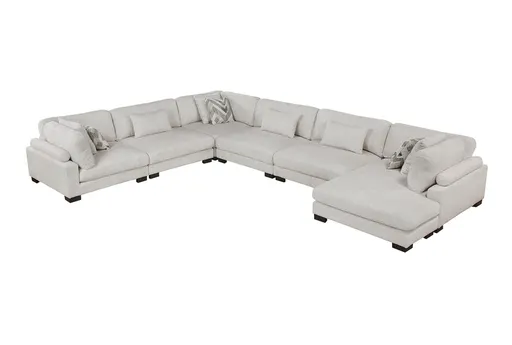 The Bianca Beige Microfiber 135" 6 Piece Modular Sectional with Right Arm Facing Chaise is the perfect addition to any casual living space. Its beige color and fabric material provide a neutral and comfortable aesthetic that complements a variety of decor styles. This sectional is designed for versatility and comfort, making it an ideal choice for family gatherings or relaxing evenings at home.