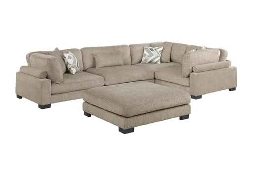 * Reversible back and loose seat cushions on the corner and armless chair, with an attached seat cushion on the ottoman
