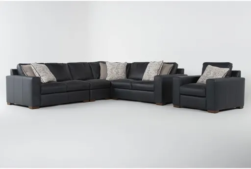 Experience the ultimate in casual comfort with the Big Sur Blue Leather 136" 4 Piece L-Shaped Modular Sectional & Arm Chair. This stunning set, designed for your living room, features a versatile reversible orientation and a timeless volcano blue color. Perfect for family gatherings or relaxing evenings, this modular design offers ample seating for everyone.