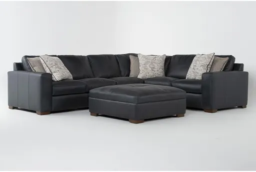 The Big Sur Blue Leather 136" 4 Piece L-Shaped Modular Sectional & Cocktail Ottoman brings casual comfort and style to your living room. Upholstered in 100% leather, this sectional offers durability and timeless appeal. The reversible orientation and modular design provide flexibility to fit your space and lifestyle needs.