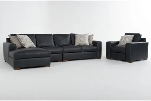 The Big Sur Blue Leather 136" 3 Piece Modular Sectional with Left Arm Facing Chaise & Chair is the perfect addition to your casual living room. Upholstered in volcano blue leather, this sectional offers both comfort and style. The modular design allows for flexible arrangement to fit your space needs.