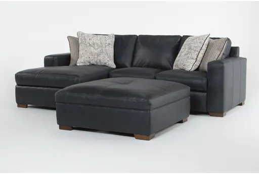 The Big Sur Blue Leather 108" 2 Piece Modular Sectional with Left Arm Facing Chaise & Cocktail Ottoman is the perfect addition to your living room. Designed for comfort and style, this sectional features soft 100% leather upholstery in a sophisticated navy hue. The modular design allows for easy customization to fit your space and needs.