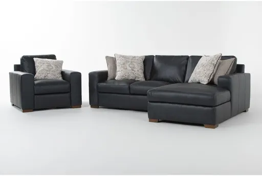 Enhance your living room with the Big Sur Blue Leather 108" 2 Piece Modular Sectional with Right Arm Facing Chaise & Chair, offering a blend of comfort and style. This right-facing sectional is designed in a casual style, perfect for creating a relaxed atmosphere. Upholstered in volcano blue, 100% leather, this modular piece is both durable and luxurious.