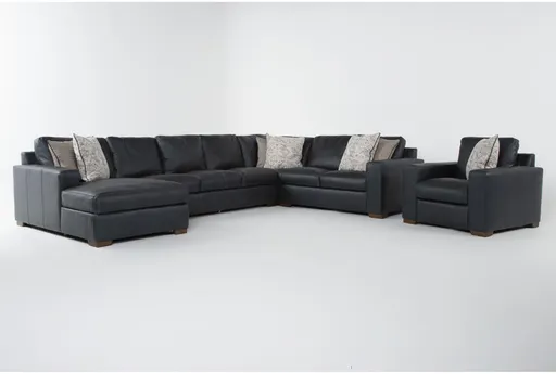 The Big Sur Blue Leather 169" 4 Piece U-Shaped Modular Sectional with Armless Sofa Left Arm Facing Chaise & Chair is a versatile and comfortable addition to your living room. Crafted from 100% leather, this sectional offers a luxurious feel and durable construction. The left arm facing chaise and armless sofa provide ample seating and lounging options for your family and guests.