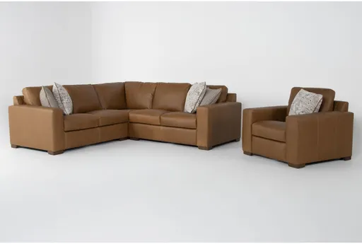 Welcome to the epitome of comfort with the Big Sur Saddle Brown Leather 3 Piece L-Shaped Modular Sectional & Arm Chair. This symmetrical design is perfect for your living room, providing ample seating and a cozy atmosphere. Made entirely of 100% leather in a stunning volcano saddle color, this set is both stylish and durable. Includes a 3 piece sectional and arm chair. Symmetrical L-shaped modular design. 100% leather upholstery in a rich saddle brown.