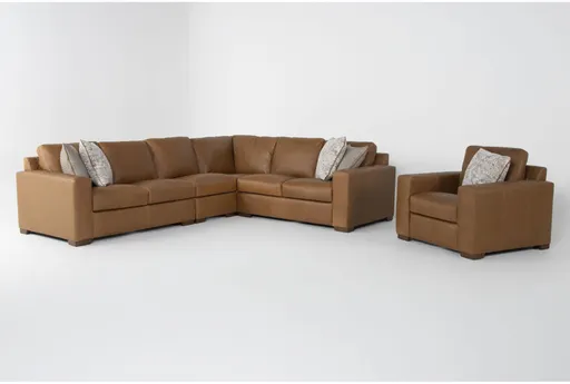 Enhance your living room with the Big Sur Saddle Brown Leather 4 Piece L-Shaped Modular Sectional & Arm Chair. This casual and timeless piece offers comfort and style, making it a perfect addition to any family room or great room. The reversible orientation and modular design offer versatility to fit your space.