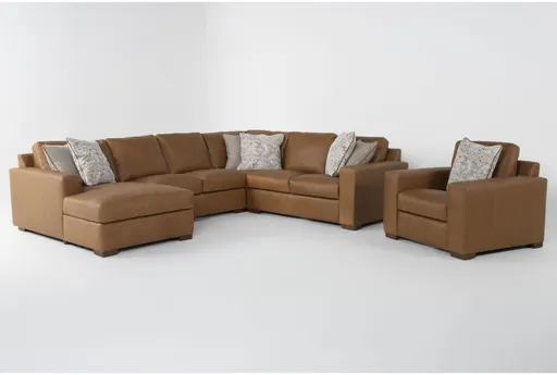 Transform your living room with the Big Sur Saddle Brown Leather 4 Piece U-Shaped Modular Sectional with Armless Loveseat Left Arm Facing Chaise & Chair. This sectional's casual style and rich volcano saddle color make it a perfect fit for any family or common room. Featuring 100% leather upholstery, it offers both comfort and durability.