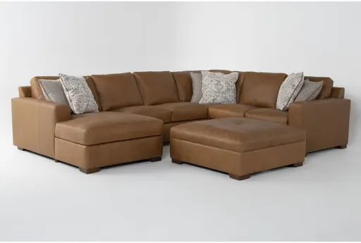 Big Sur Saddle Brown Leather 141" 4 Piece U-Shaped Modular Sectional with Armless Loveseat Left Arm Facing Chaise & Cocktail Ottoman | Furnzy.com - Shop local furniture stores in one place