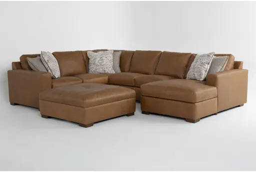 Introducing the Big Sur Saddle Brown Leather 4 Piece U-Shaped Modular Sectional, designed to bring comfort and style to your living room. This sectional features a right arm facing chaise and an armless loveseat, complemented by a cocktail ottoman for added versatility. The rich volcano saddle color and 100% leather material ensure durability and a timeless look.