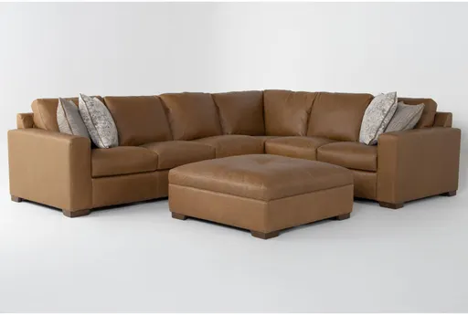 Introducing the Big Sur Saddle Brown Natural Leather 4 Piece L-Shaped Modular Sectional & Cocktail Ottoman. This versatile sectional offers a casual yet sophisticated look for your living room. With its reversible design, you can easily adapt it to fit your space.