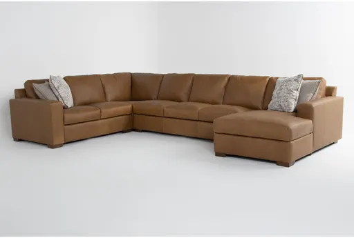 Big Sur Saddle Brown Natural Leather 169" 4 Piece U-Shaped Modular Sectional with Armless Sofa & Right Arm Facing Chaise brings oversized lounging and modular flexibility to the living room. Upholstered in 100% leather with a saddle brown natural finish, this modular sofa pairs deep-seated cushions and a track arm profile to deliver a relaxed yet structured silhouette that fits modern living room furniture needs. The four-piece layout includes an armless sofa and a right facing chaise, creating true u-shaped sectional coverage and ample seating for family-size gatherings.