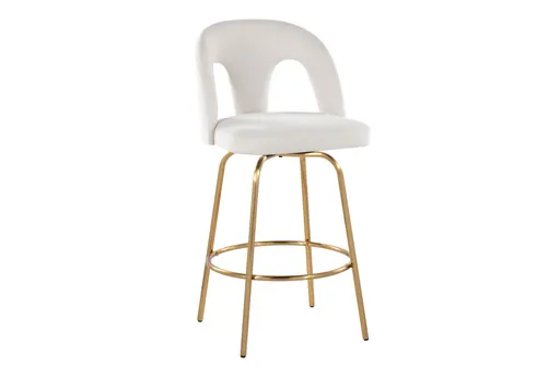The Billings Snow White Fabric Upholstered Swivel 26-inch Counter-Height Stool in gold metal with gold footrest, set of 2, brings comfortable, contemporary seating to your kitchen island or counter. The armless, curved seat with a cutout back is upholstered in snow white polyester fabric and cushioned with foam for everyday comfort. A gold metal base with an integrated footrest and smooth swivel motion makes it easy to turn toward conversations without standing up.
