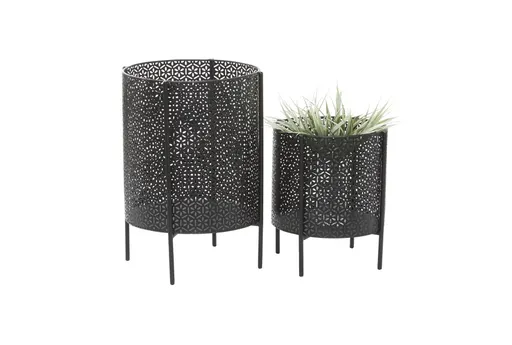 The use of a plant and soil bag is advised or the use of plants with an aerial root system to refrain from using soil. This item ships in 1 carton. Please note that this item is for decorative use only. Suitable for indoor and outdoor use. This item ships fully assembled in one piece. Maximum weight limit is 5 lbs. Planters do not have drainage holes but they are not watertight. This black colored plant pot comes as a set of 2. Contemporary style.