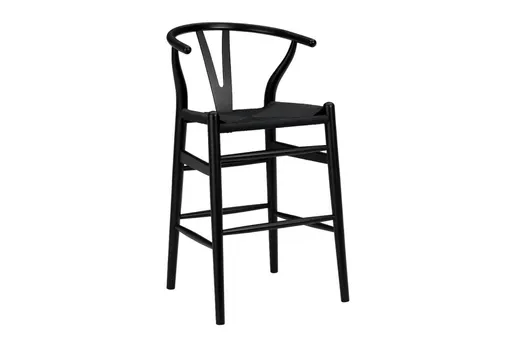 The Black Wishbone 26" Counter Height Stool pairs a signature wishbone silhouette with a supportive semi-circle back and a firm woven rattan seat that breathes for all-day comfort. A solid wood frame with spindle tapered legs and reinforced joinery gives this modern piece structural integrity while keeping the profile streamlined and minimalistic. The black painted finish contrasts with natural rattan texture for a refined, contemporary look that complements modern decor and modern living room furniture. At 26 inch counter height the stool includes an integrated footrest and a compact footprint, making it an excellent small space solution for islands, breakfast bars and compact dining nooks.