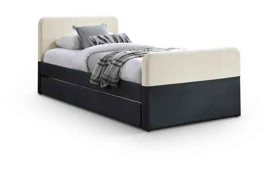 The Blaise Black & Cream Twin Velvet Upholstered Platform Bed With Pull-Out Twin Trundle brings a modern two-tone look to a kid's room while maximizing sleep space for everyday use and sleepovers. Velvet upholstery over foam offers a soft, inviting surface, and the platform base with poplar LVL support plus MDF and particle board panels provides stable support without a box spring. A pull-out twin trundle tucks neatly beneath the frame to expand sleeping capacity when guests stay overnight, making it a practical choice for compact bedrooms.