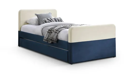 Blaise Navy & Cream Twin Velvet Upholstered Platform Bed With Pull-Out Twin Trundle pairs plush velvet in navy and cream with a low-profile platform and a pull-out twin trundle for a practical, design-forward sleeping solution. Velvet upholstery covers a padded headboard and rounded footboard while the frame combines poplar LVL, MDF and particle board with foam padding for comfort and durability. The platform base supports a mattress without a box spring and the trundle on casters tucks away for easy storage and quick sleepover setup. Built to maximize sleeping capacity in compact spaces, this twin bed brings comfort and function to kids' or guest rooms.
