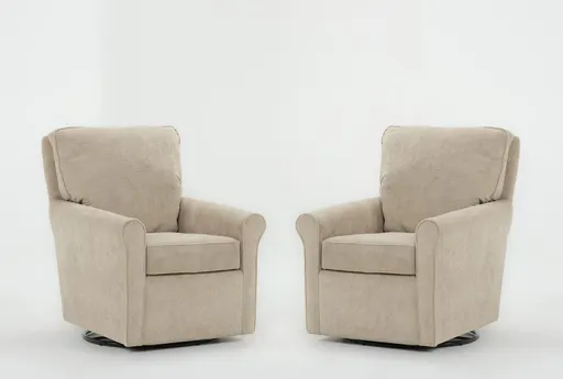 Blissbound Swivel Glider Armchair Set of 2 brings relaxed, everyday comfort to your living room with a smooth swivel glider mechanism that lets you turn and rock without getting up. Each chair is upholstered in 100% polyester fabric and features supportive seat cushioning and a padded rolled arm for comfortable lounging. The pair is made in the USA and designed to fit casual interiors where durable, easy-care seating is welcome. Smooth swivel glider mechanism lets you rotate and rock for flexible movement. Upholstered in 100% polyester fabric with supportive seat cushioning for long-lasting comfort. Includes two chairs and is made in the USA, perfect for living room seating or a cozy reading corner.