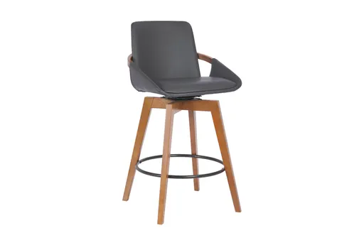 Blossom 26" Grey Faux Leather And Walnut Wood Swivel Counter Height Stool brings mid-century modern character to your dining room while keeping seating comfortable and practical. The seat is upholstered in grey faux leather with a curved back and an integrated open arm that supports relaxed, upright sitting. Walnut wood legs pair with an iron footring and swivel hardware to deliver steady support and easy movement around the counter.