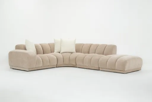 Blossom Modular Rose 124" 4 Piece Sectional With Left Arm Facing Chair offers a modern, low-profile L-shaped seating group that anchors a living room with soft curves and channel-tufted detailing. Upholstered in beige 100% polyester fabric, this four-piece modular sectional has deep-seated cushions for roomy, relaxed lounging and rearranges easily to suit movie nights, casual entertaining, or a cozy family gathering. Modular: Four-piece configuration with a left-facing chair lets you customize the layout for your space. Comfort: Deep-seated cushions and channel tufting deliver cushioned support for lounging and naps. Upholstery: Beige 100% polyester fabric provides a soft touch and a neutral base that layers well with pillows and rugs.
